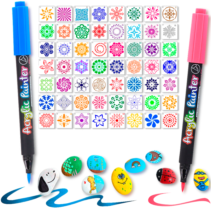 Faça pinturas profissionais em poucos minutos utilizando os moldes de pintura. São 56 designs de tamanho 9x9cm para seus projetos artesanais. basta aplicar sobre a superfície e usar as Canetas Color Brush para pintar por cima!
