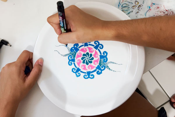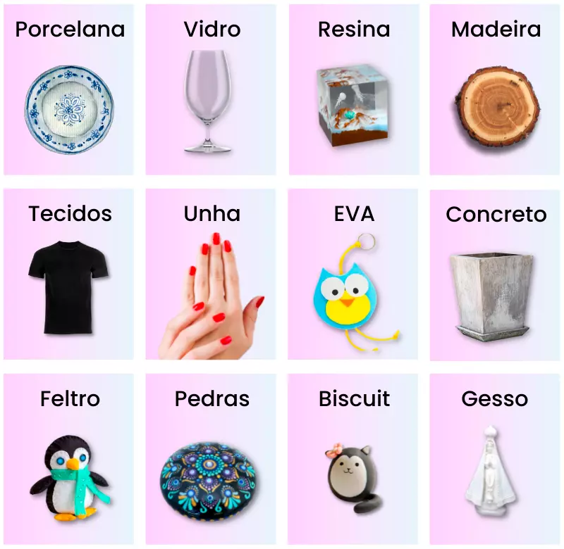 Você pode pintar em vasos de porcelana, xícaras, pratos, camisas, paredes, mesas e muito mais!