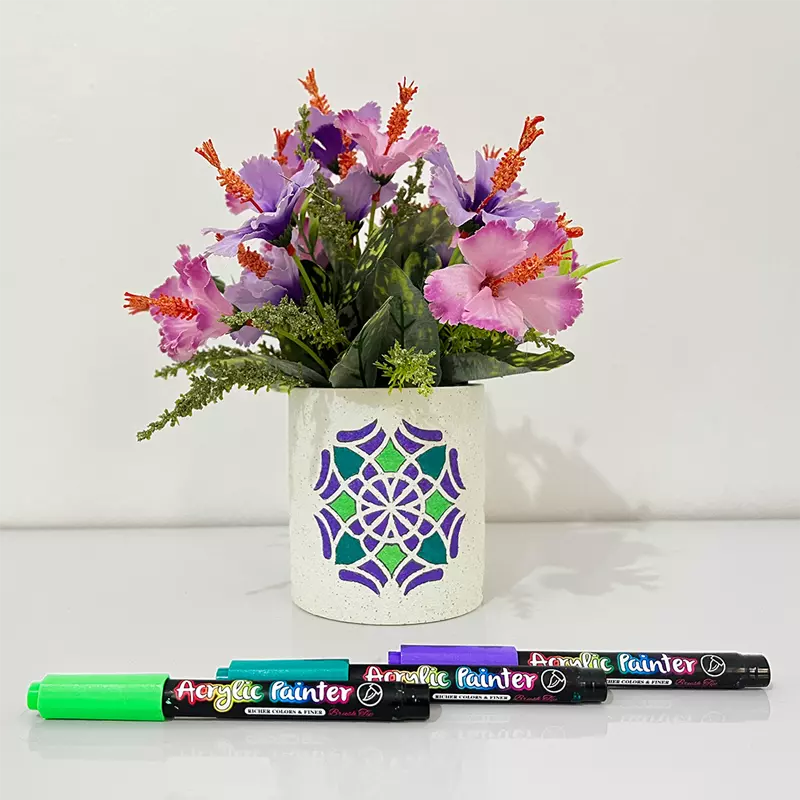 Sou novata na pintura e essas canetas foram minha salvação! Eu tinha muita dificuldade em usar tintas e acabava borrando tudo e sujandotoda todo o meu pátio. Agora eu consigo fazer artes lindas em pouco tempo, graças as canetinhas e os moldes vazados!